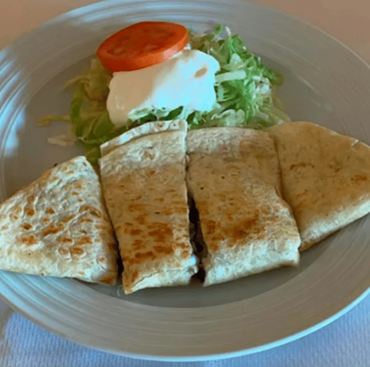 Flour Tortilla stuffed with your choice of meat with mozzarella cheese, accompanied by salad.