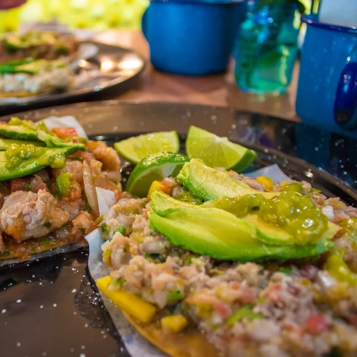 Fish cooked in lime juice cilantro onion jalapeño tomatoes on a golden fried tostada with a mayo base