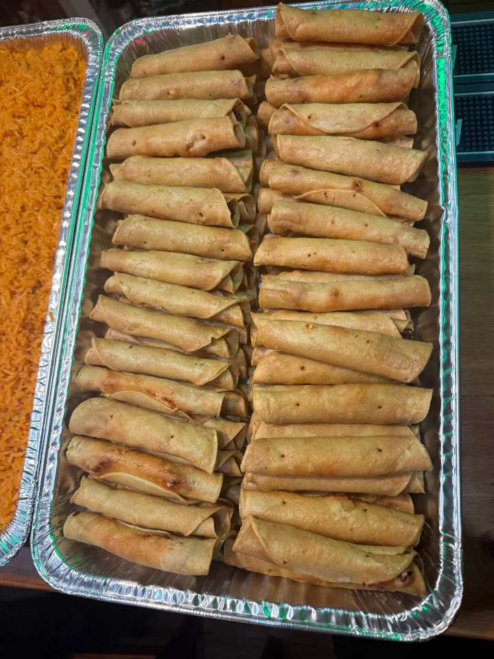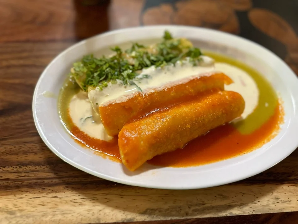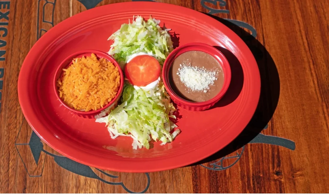 Fried taquitos filled with chicken, topped with lettuce, tomato, crema fresca, Mexican cheese & served with rice & beans.