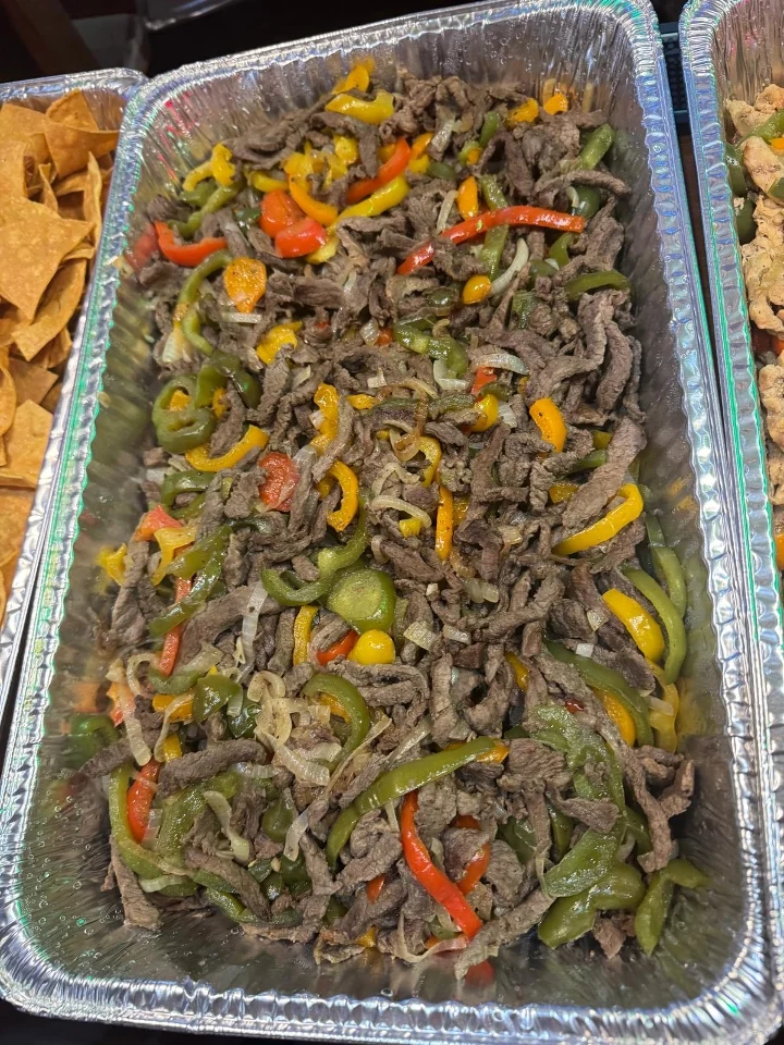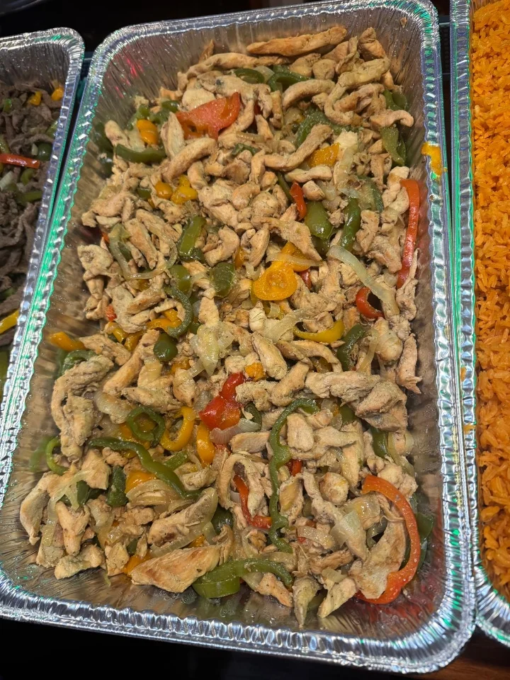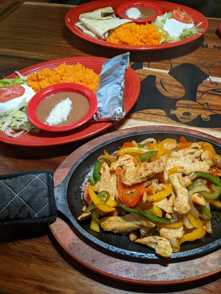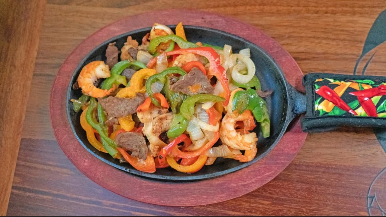 Delicious Chicken, Beef and Shrimp fajita with vegetables. Served with rice, salad, beans and 3 tortillas