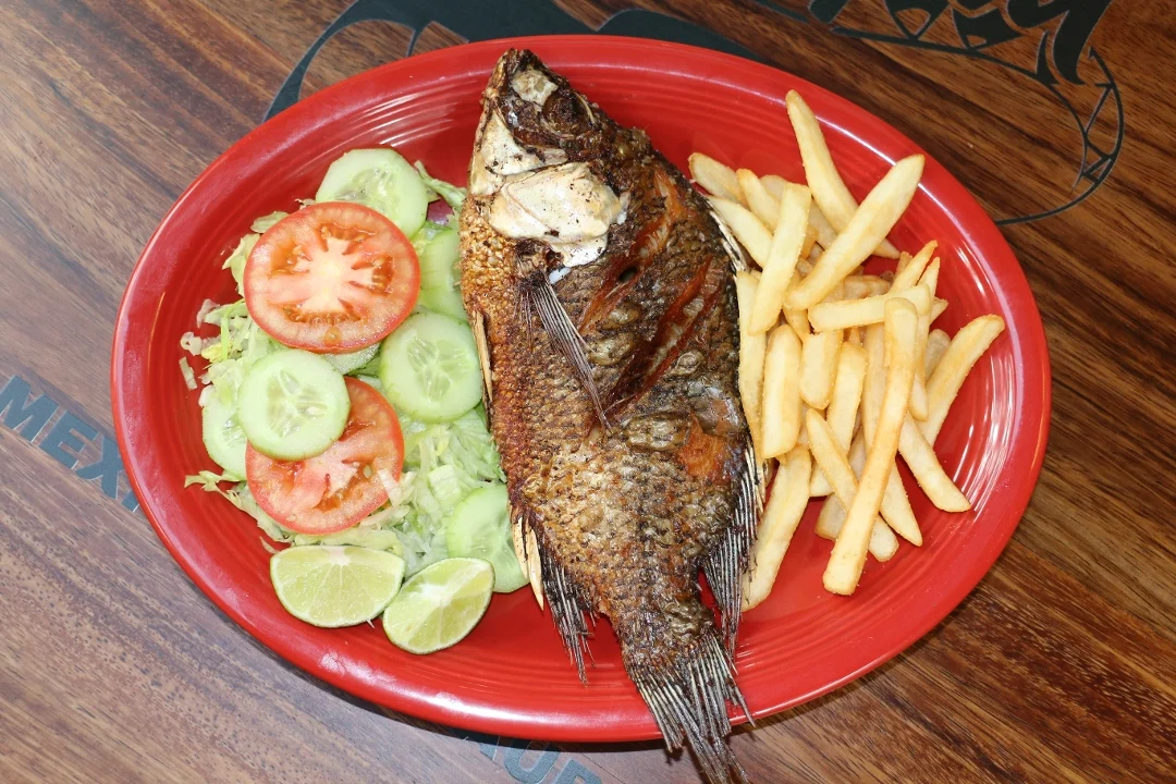 Fried whole tilapia served with salad, rice, french fries 3 tortillas