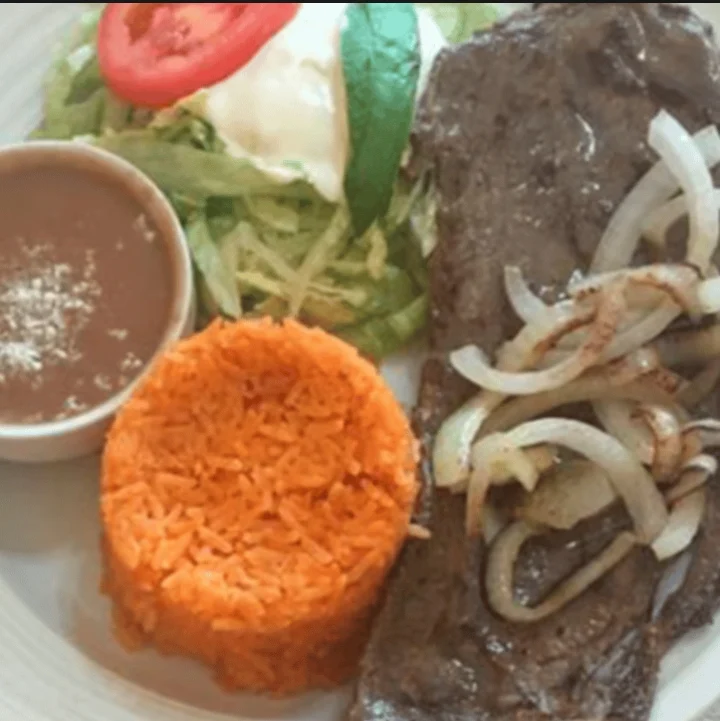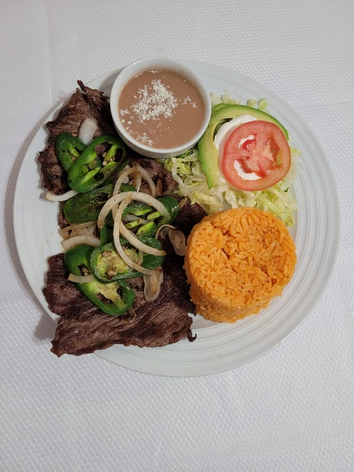 Delicious Flank Beef cooked to perfection.Served with Rice, Beans, Salad, 3 Tortillas,Steak is topped with Grilled Onion, Grilled Jalapeño