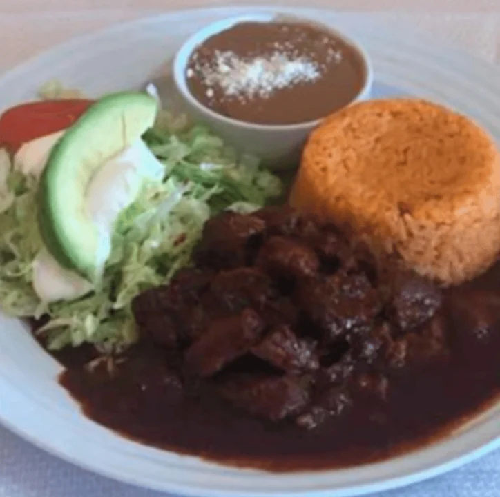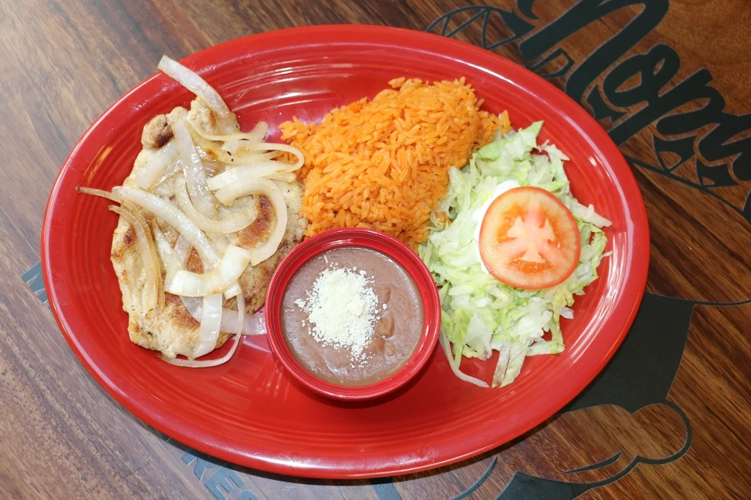 Pork covered with Mexican sauce, served with rice, beans, salad and 3 tortillas.