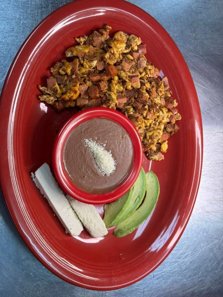 Scrambled eggs with chorizo, side of beans, cheese, avocado.