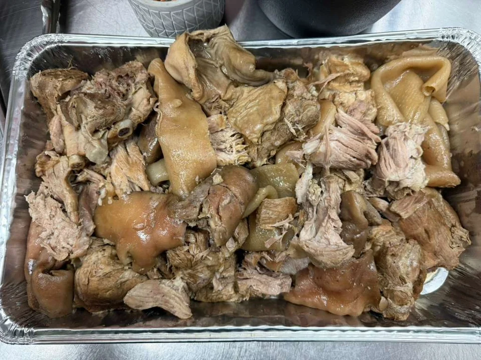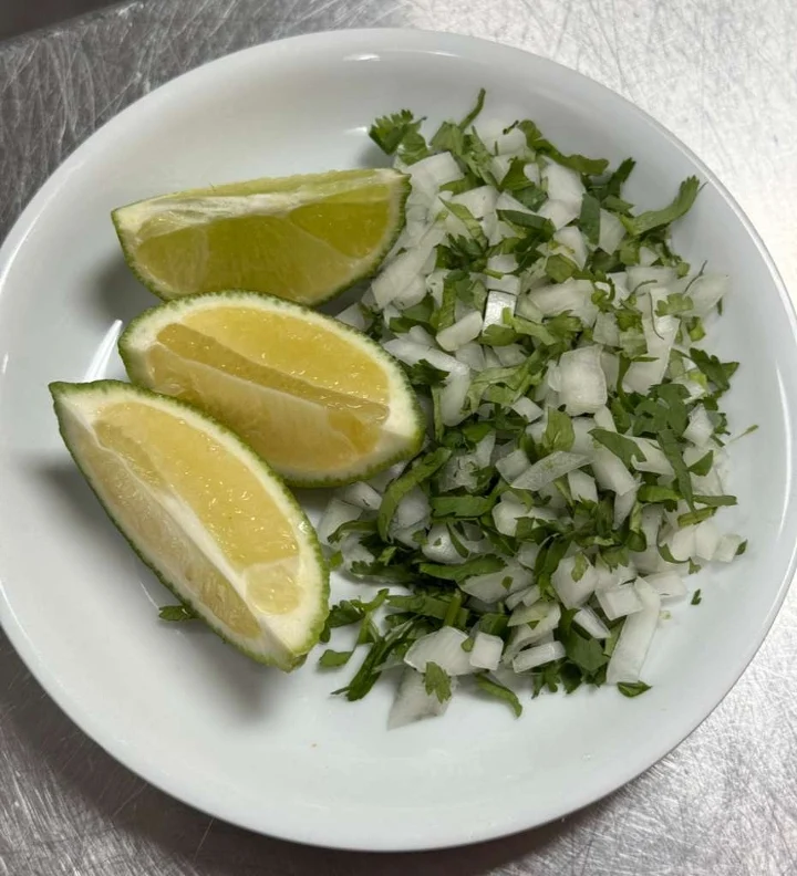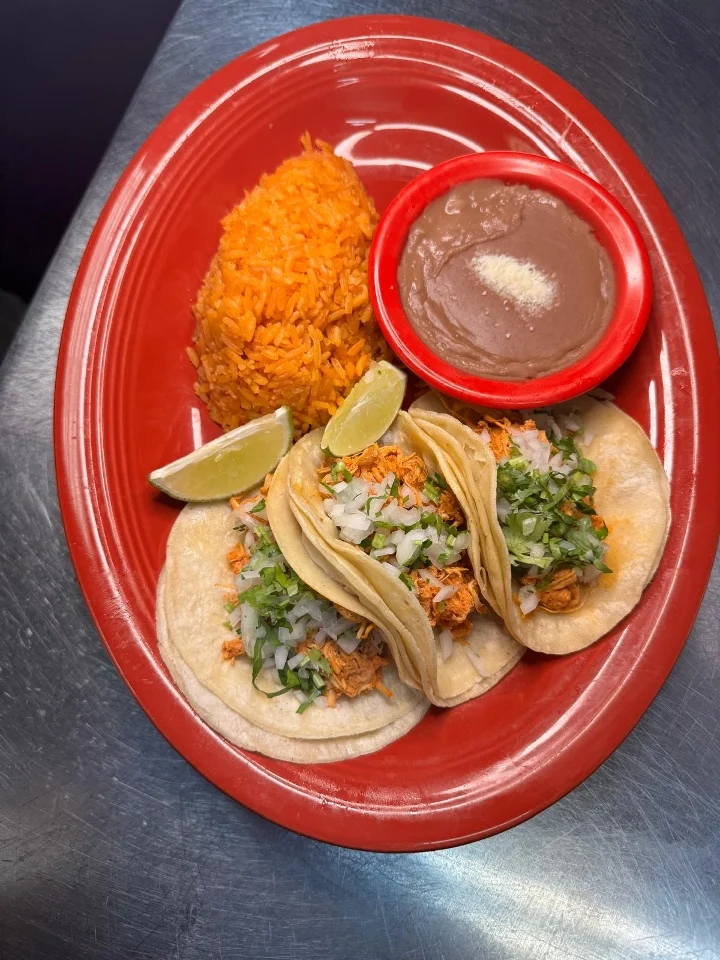 Braised Pork paired with Cilantro, Onion, Rice, Beans, 3 Tortillas Add Sliced Avocado +$3