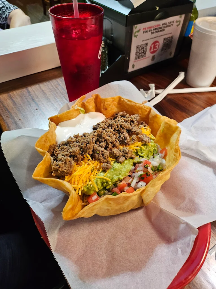 Golden fried taco shell filled with beans, lettuce, grilled onions, peppers, pico de gallo, guacamole, sour cream, protein of your choice.