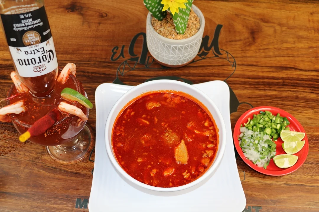 Braised pork with hominy, served with lettuce, onion, radish, onion, lime, and 3 tostadas