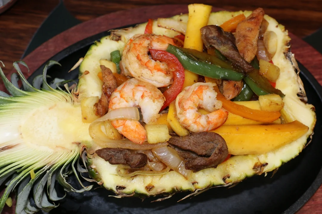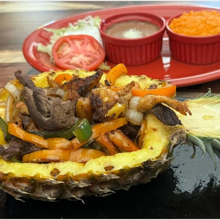 Grilled chicken, beef, and shrimp with sautéed onions, bell peppers, pineapple, and mango. Served in a pineapple, with rice, beans, lettuce, pico de gallo +3 tortillas, sour cream.