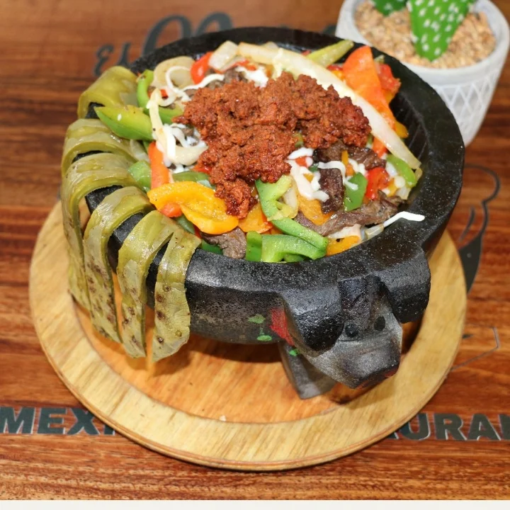 Flank steak, chicken, chorizo, shrimp, nopales, onion, peppers in a clay pot. Served with rice, beans, salad 3 tortillas