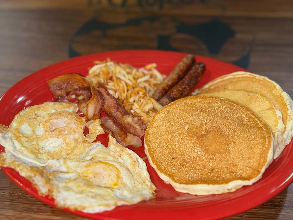 Fried eggs served on a lightly fried tortilla, smothered in cooked salsa, avocado slices, Mexican cheese, topped with crema. Add steak for $3.